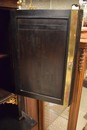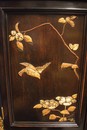 Cabinet on Stand. Four claw feet. Dark Stained wood, two doors decorated with birds and flowers in coloured bone.