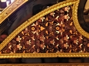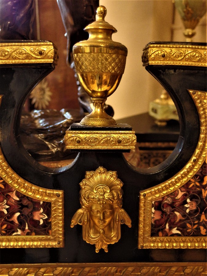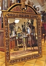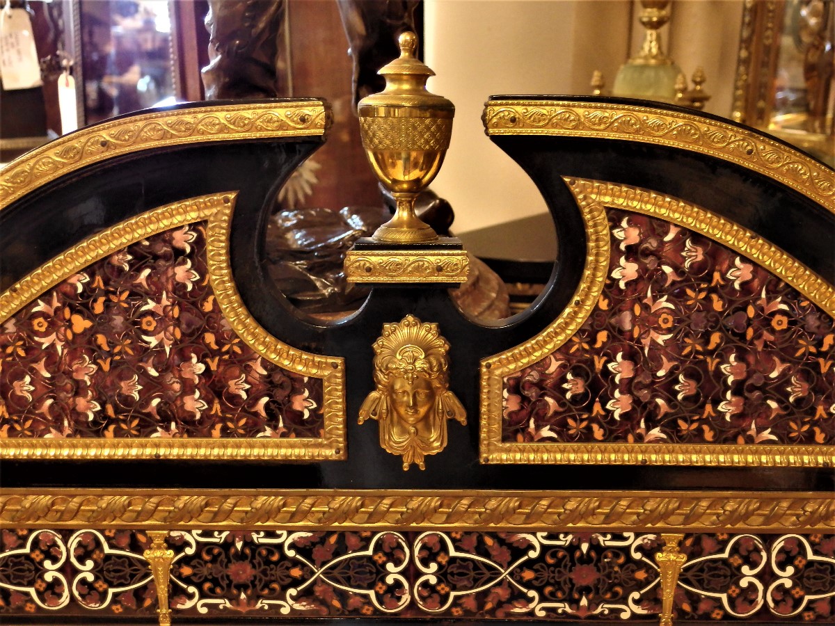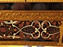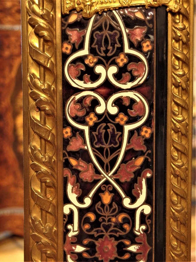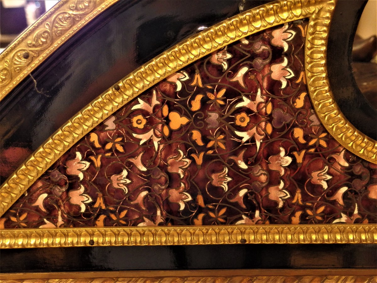 In a beautiful enamelled and gilt brass frame with a broken pediment crowned with a vase and female-head and corner spandrels.