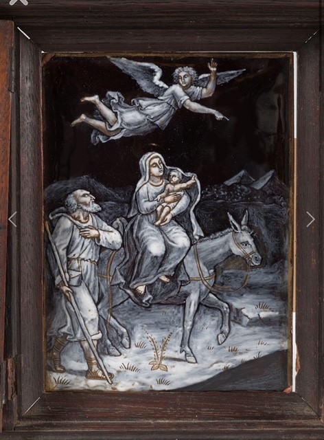 A 16th century Limoges triptych representing the Holy Family fleeing to Egypt , some losses in the enamel